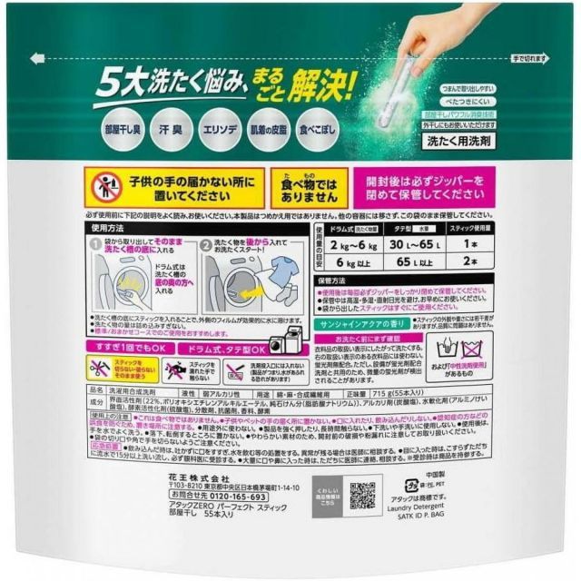 10万粒の発泡パウダーが一気に広がる!じめじめ部屋干し臭・汗臭、まるごと一発洗浄!部屋干しパワフル消臭技術搭載。部屋干し臭・汗臭・エリソデ・肌着の皮脂・食べこぼしの「5大洗たく悩み」、まるごと解決!そのままポン!と計量いらず。つまんで取り出しやすく、べたつきにくいスティックタイプ。消臭・抗菌※・洗たく槽防カビ※も。すすぎ1回でもOK。サンシャインアクアの香り。※すべての菌・カビの増殖を抑制するわけではありません