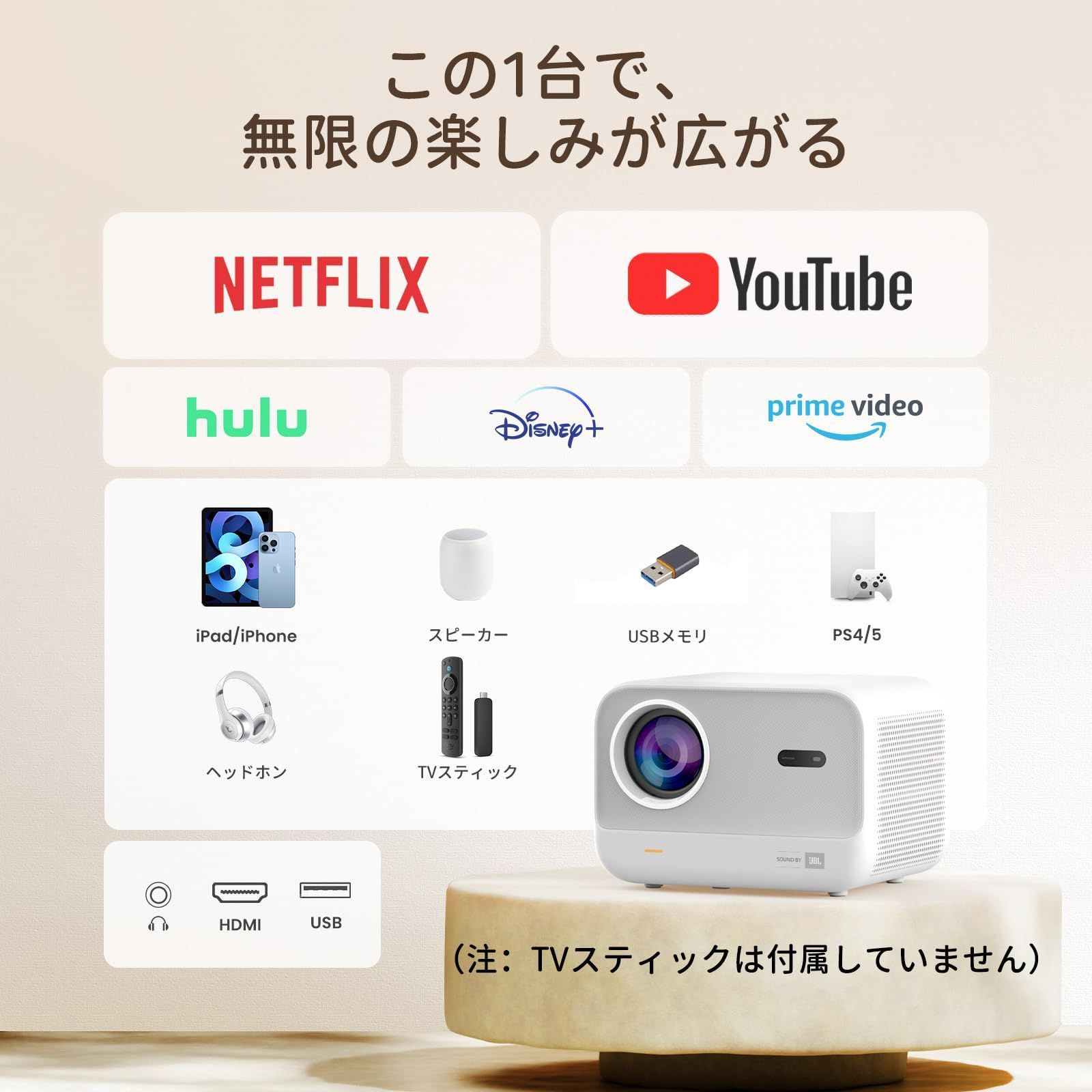 【超高速WiFi 6 & 双方向Bluetooth】最新のWiFi 6と双方向Bluetooth機能により、高速かつ安定したワイヤレスストリーミングを実現します。WiFi 6は、混雑した環境でも途切れることなくスムーズな接続を提供します。さらに、このホームプロジェクターは双方向Bluetoothをサポートしており、JBLスピーカーとしても活躍します。