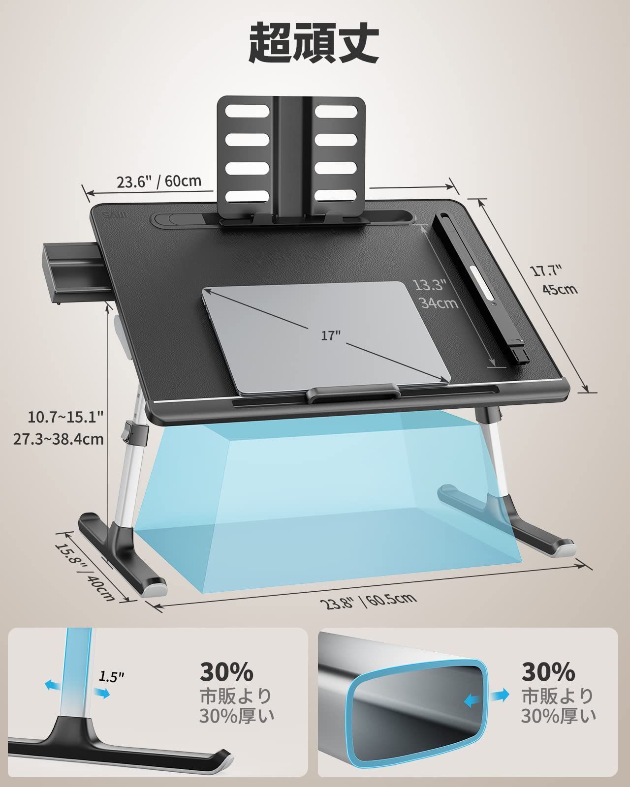 【高度・角度を自由調整】5段階の高さ(27~39cm)を調節できて、お子様から大人まで幅広く適用しています。 天板の下には充分なスペースが用意され、窮屈感なく快適に使用できます。4段階の角度(0~36°)もお好みに 合わせてご自由に調整していただけ、映画を見ながらベッドやソッファで快適に休日を過ごせます。