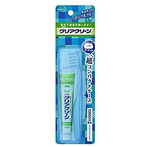 携帯しやすいクリアクリーンの歯みがきセット。外出先でもしっかりツルツル。 薬用ハミガキは、顆粒(清掃剤)が歯のすき間でくだけて、奥の歯垢まですっきり落とし、むし歯・口臭・歯肉炎を予防します。 ハブラシは、軽い力でも歯垢をごっそり落とせるクリアクリーン極太毛束(ミニサイズ)。ザクザク磨けて歯垢をごっそり落とします。 ポーチに入る超コンパクトケース。