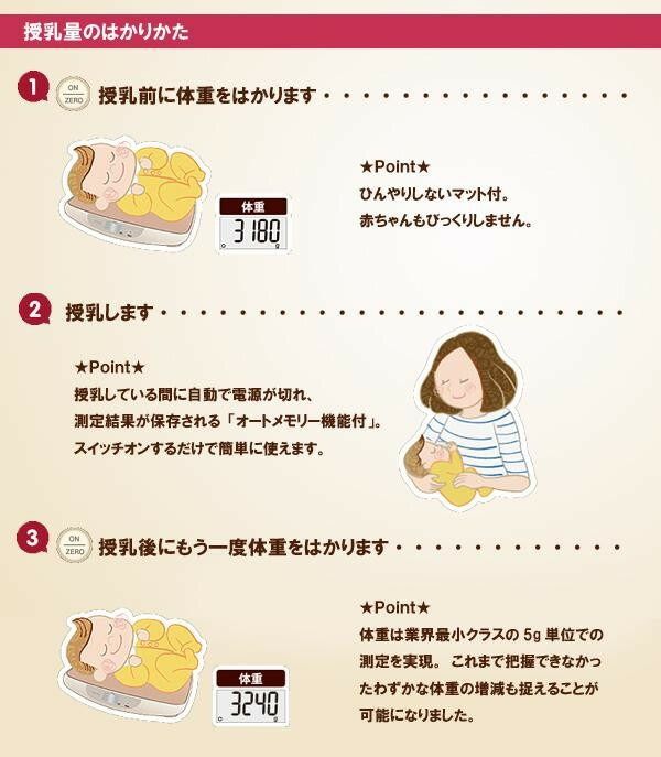 授乳量を授乳前後の赤ちゃんの体重の差から計算します。授乳量は1g単位で測定できるので、ミルクの摂取量を細かく把握できます。日々の体重測定にも大活躍します。