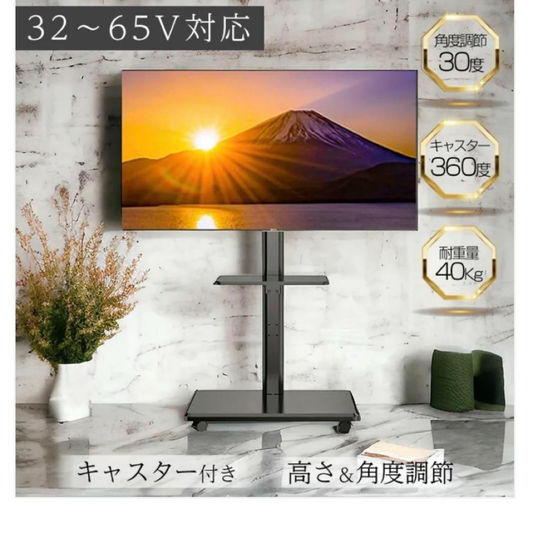 高さ調整機能付きの白いテレビスタンド、32〜65V対応。