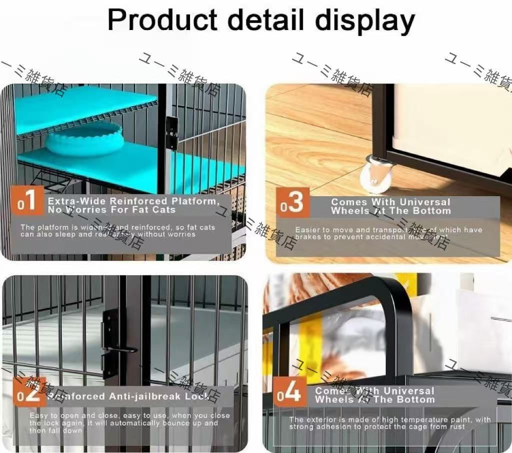 パッケージ内容: 猫ケージ + 密閉型猫トイレ + 猫砂シャベル + 吊り下げ給餌ボウル + ケーブルタイ
