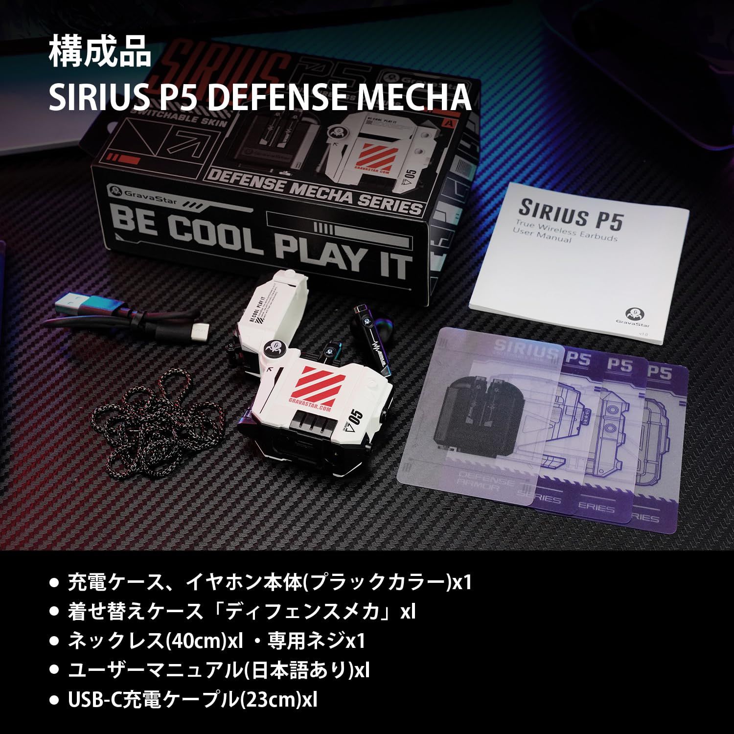 【目を引く独創的なデザイン】近未来感溢れる見た目の完全ワイヤレスイヤホン。機甲バトルのコンセプトをベースに、メカメカしい外観をデザイン。保護ケースと充電ケースの分離設計で、保護ケースが着せ替え可能。ボタンを押すと保護ケースのフタが開く。専用のネックレスチェーンを備えており、コーディネートのアクセサリーにも使える。市販の普通のイヤホンより、いっぱい設計感がある。