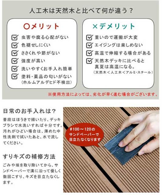 ■備考※人工木は高い強度がありますが、鋭利なものなどで強い衝撃を与えると、割れやへこみが生じることがありますのでご注意ください。