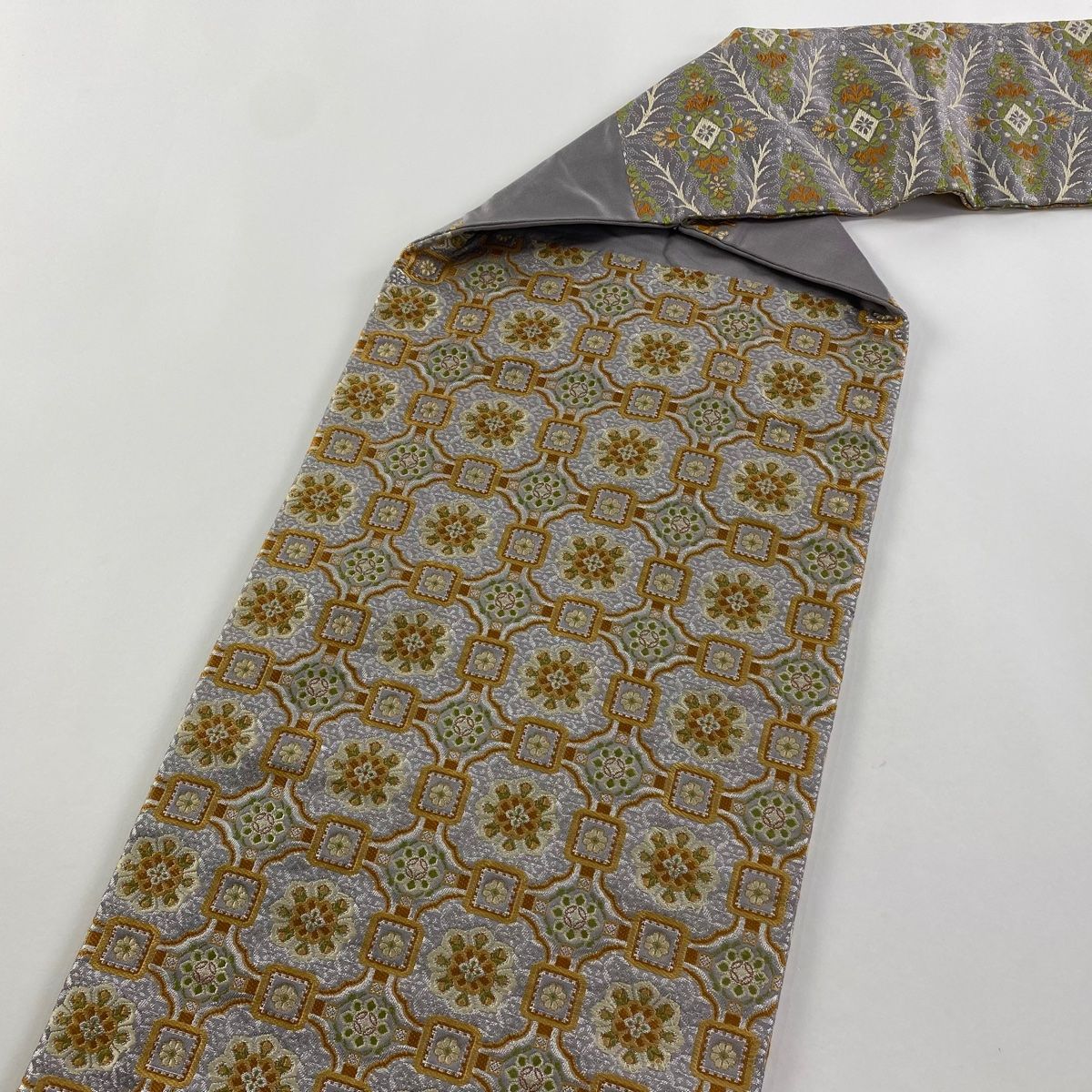 名古屋帯 秀品 比翼仕立て 草花 菱 箔 灰紫 正絹