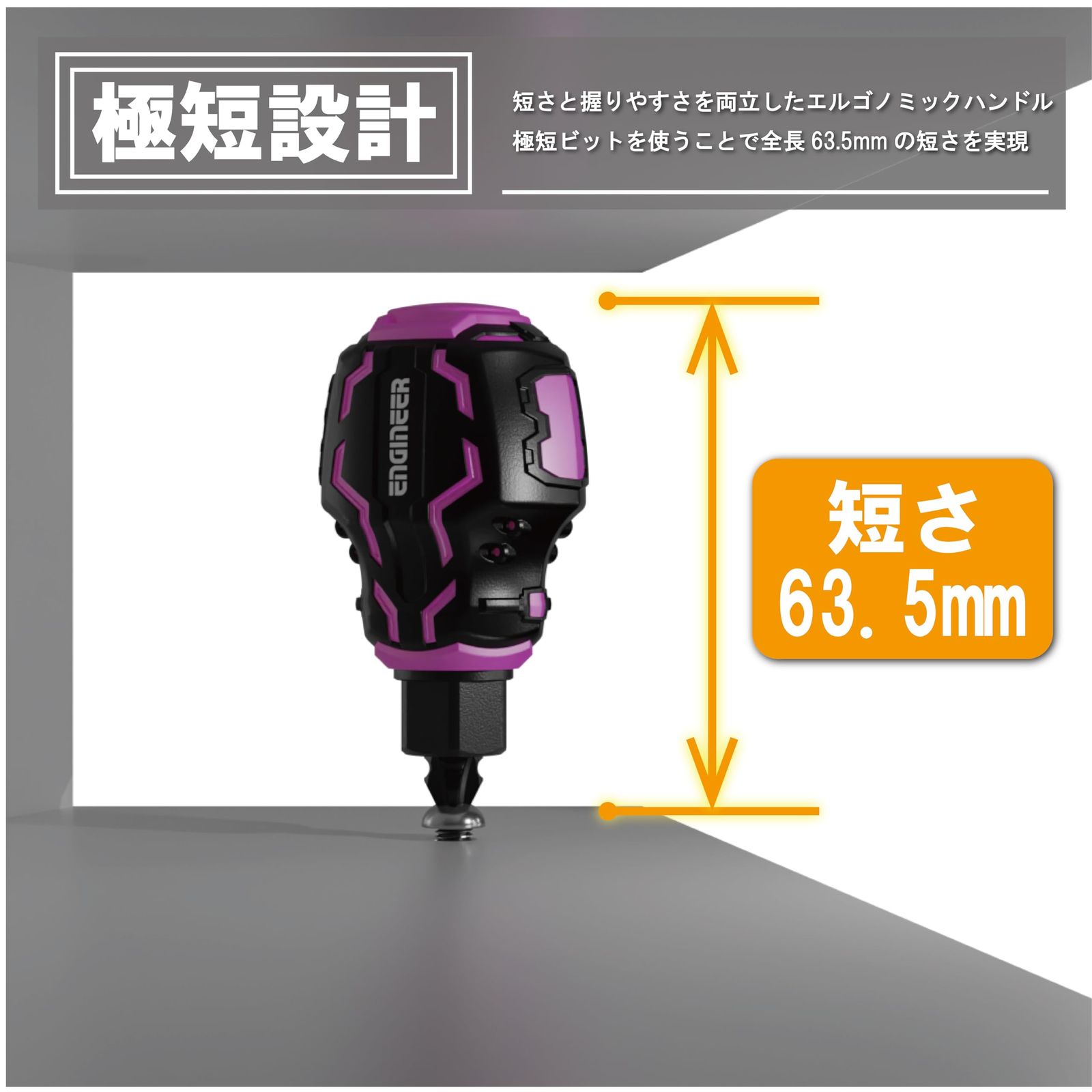 全長63.5mmで、狭い場所での作業に便利なコンパクトボディ。