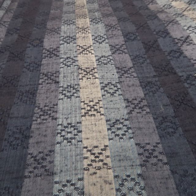 こちらのお着物は、縦縞が描く紺のグラデーションに花織の点模様を添えた一枚。すっと縦に流れるラインが着姿を端正に見せ、近づくほどに浮かび上がる花織が素朴な立体感を生みます。