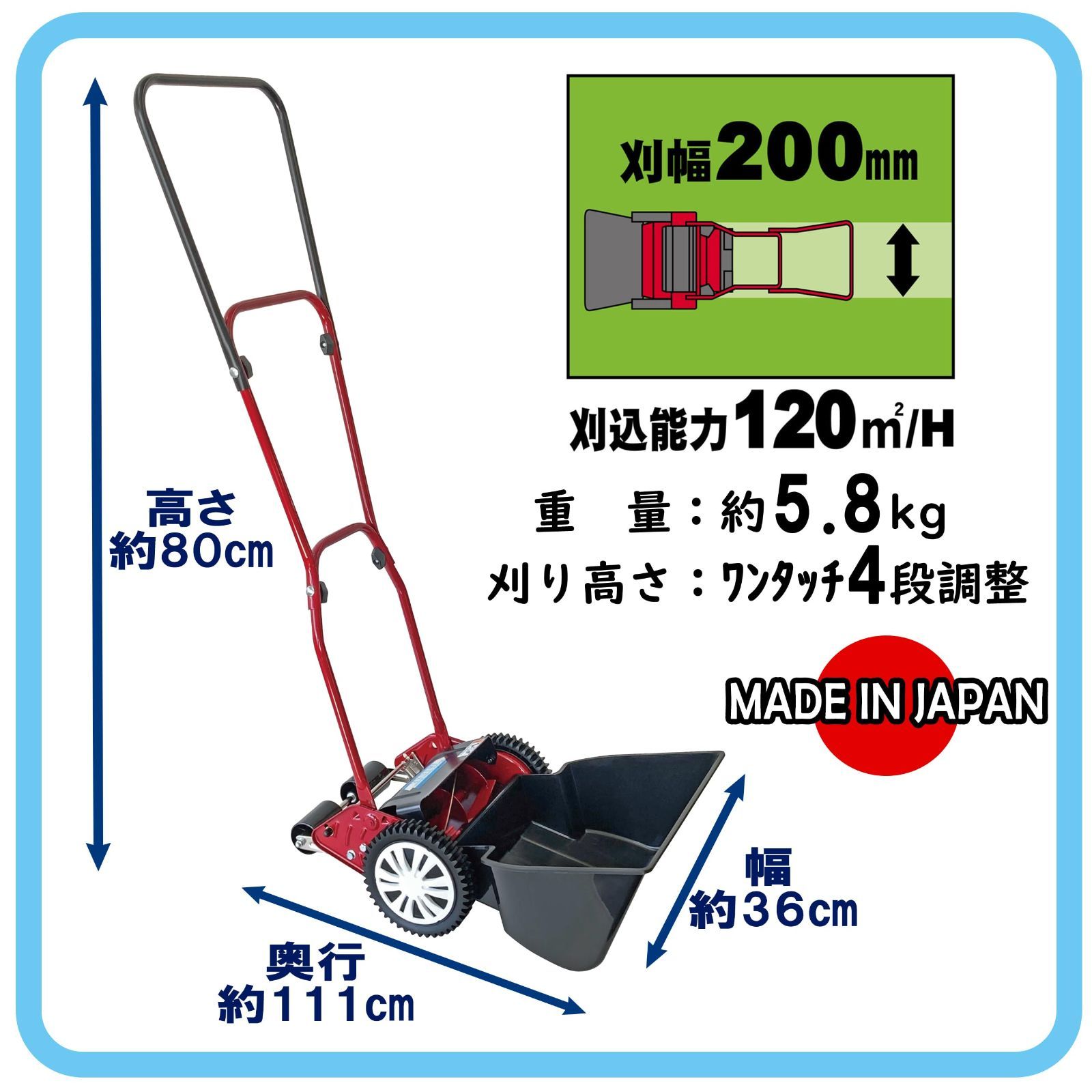 手動式なので簡単で軽量、コンパクトなので保管場所に困らない、当社従来機種に比べ芝刈り音が約6%、後ろに下がる音が約16%静かに!