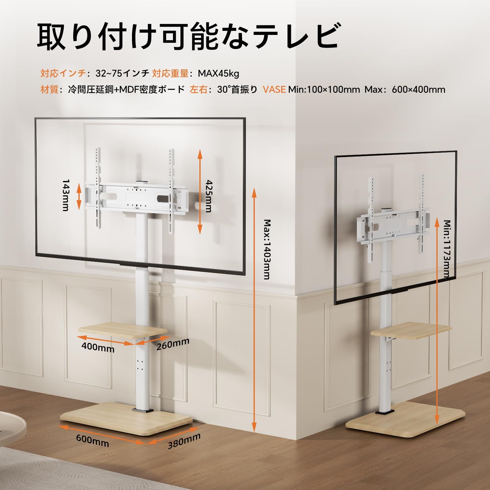耐荷重45 kg VESA 横100~600 mm 縦100~400 32 75インチ対応 木目調 キャスター付き tvスタンド おしゃれ テレビ台 ホワイト ハイタイプ 壁寄せ テレビスタンド BEISHI