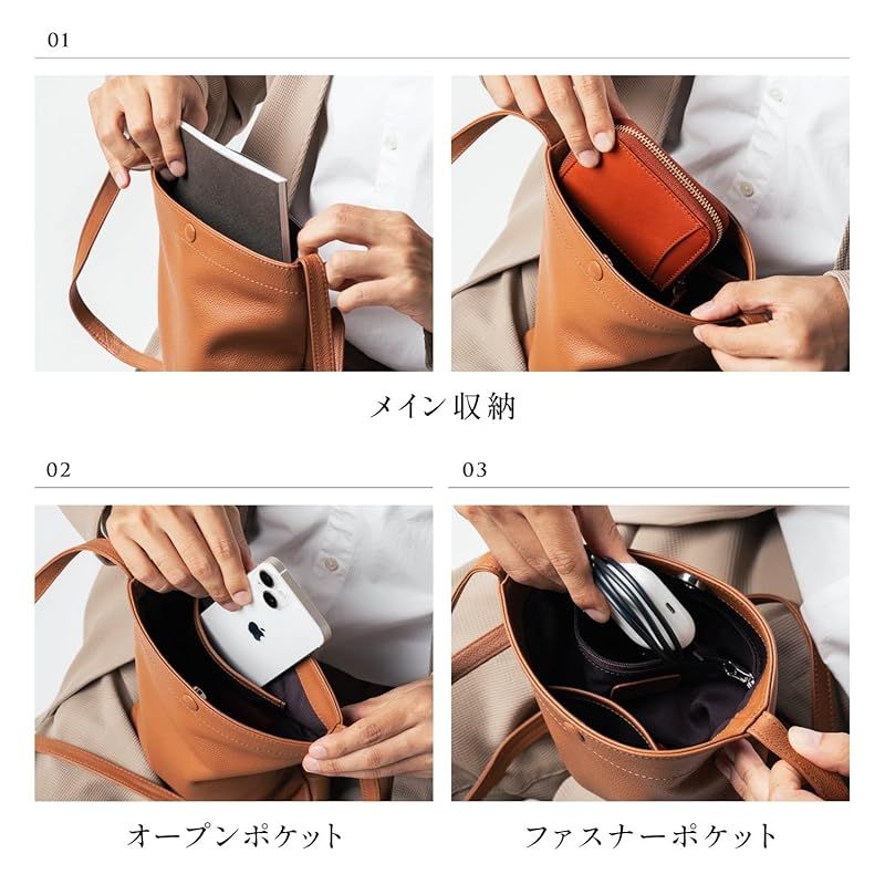 ?【仕分けできる収納ポケット】大事な財布やスマホなどしっかり分けて収納可能。 メイン収納は財布やA5サイズのノートなどの収納に便利です。 オープンポケットはスマホなどすぐに取り出しやすいポケット。 ファスナーポケットはごちゃごちゃしやすい小物を入れるのに便利です。