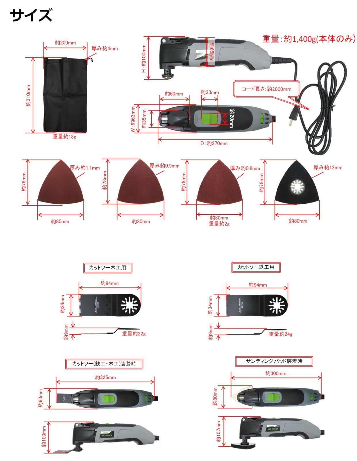 セット内容:本体×1・カットソー鉄工用×1・カットソー木工用×1・サンディングパッド×1・サンディングペーパー#60/#80/#120×各1・収納袋×1・取扱説明書×1