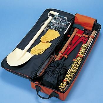 平バール(900mm)、ボルトカッター(600mm)、折込みのこぎり(刃渡り210mm)、大ハンマー(両口3.5kg)、丸カケヤ(直径150mm)、バチヅル(1.8kg)、ショベル(丸型935mm)、誘導用ロープ(10m)、牛革手袋(×2)、ゴーグル(×2)、防塵マスク(×2)、ホイッスル(×2)、三角巾(×1)、ガーゼ(×2)、包帯(×2)、ウェットタオル(20枚入)