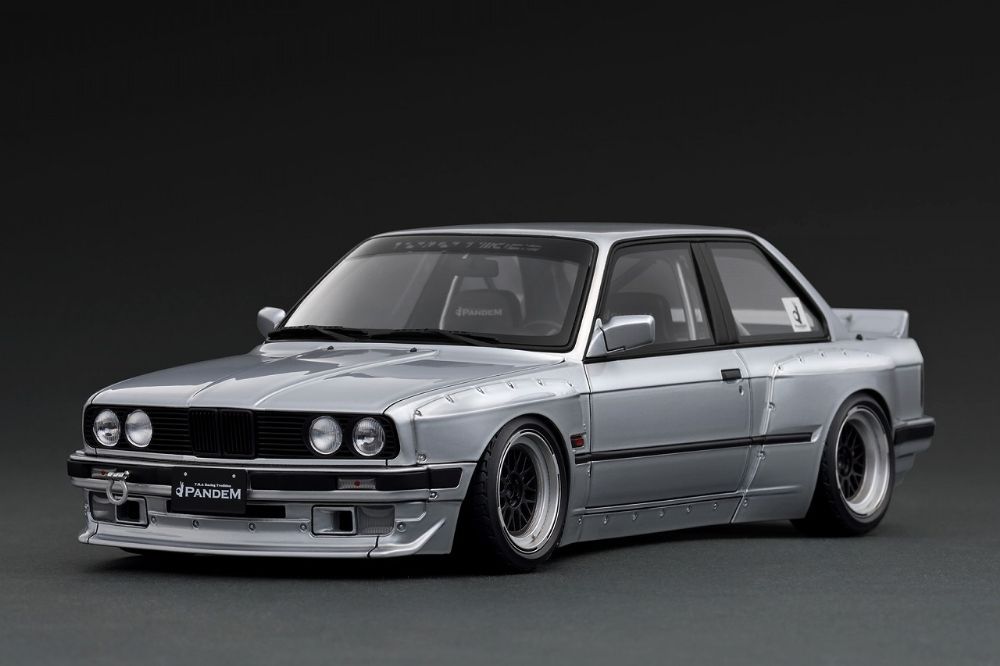PANDEMのデモカー「30」を1/18スケールレジンモデルで再現。ボディカラー:シルバー。PANDEMオリジナル17インチメッシュホイール(シルバー&ブラック)にローダウン仕様。専用ボディキット(フロントバンパー、前後ワイドフェンダー、リヤスポイラー)、フロントウィンドウ上部とクォーターウインドウ「PANDEM」ロゴ、レッドキャリパー、フロントバンパーに牽引フック、PANDEM製バケットシート、ナルディタイプステアリング、ロールケージ、シングルマフラーを装着。