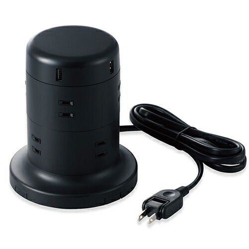 合計最大出力が4.8AのUSBポートを5つ備えたタワー型8口の電源タップです。USBポートや差込口は360度放射状に配しており、会議室の机などでの利用に最適です。