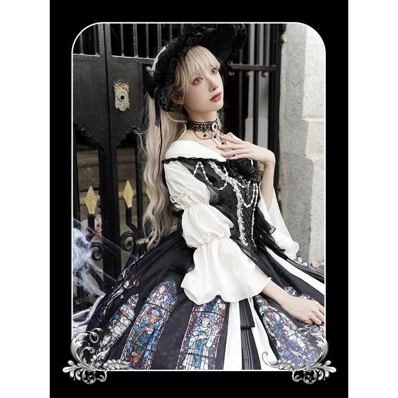 ワンピース ロリータ ステンドグラス風 ミモレ丈 ジャンパースカート オフショルダー レディース 長袖 クラロリ ゴスロリ ゴシック 暗黒風