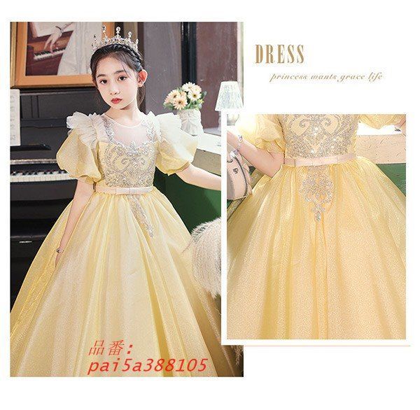 短袖 キッズドレス ピアノ 発表会 キッズ 子ども イエロー ロング丈 演奏会 パーティー 女の子 音楽会 女児 ステージ衣装 合唱 演出 披露 pai 5 a 388105