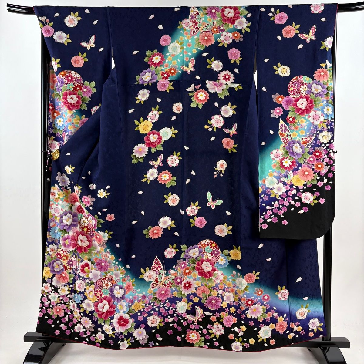 振袖 身丈160.5 cm 裄丈68 L 袷 手鞠 牡丹 ラメ ぼかし 濃紺 正絹