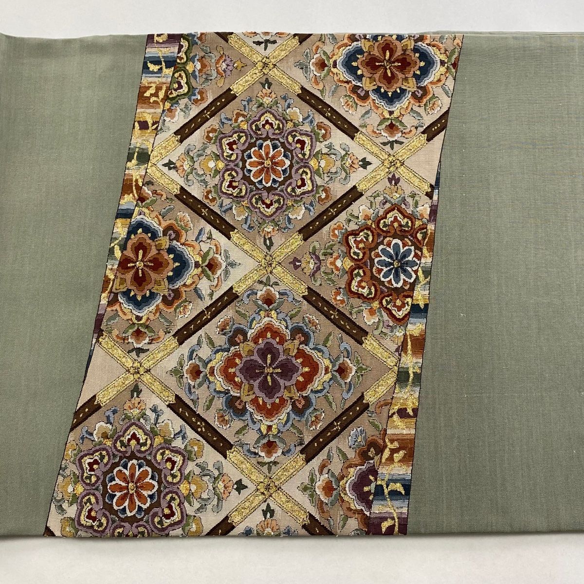 袋帯 華文 菱天井 金糸 灰緑 お太鼓柄 正絹