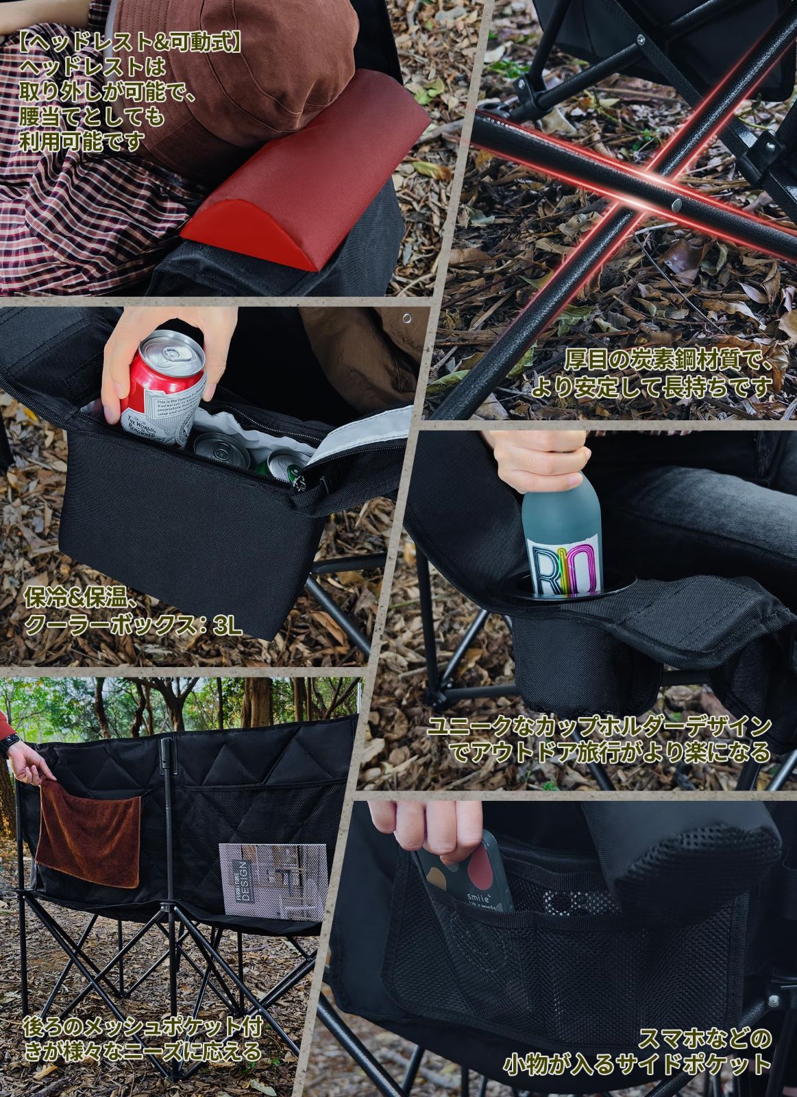 【追加功能】:枕+サイドポケット+ドリンクホルダー+弾性メッシュバッグ◆【3WAY枕】頭部のクッションは移動可能で、枕としてだけでなく、腰当てや肘置きとしても使用できます。腰部、肘部、頭部のリラックスを助けます。◆【サイドポケット+ドリンクホルダーが付き】ドリンクやスマホなど、手に届く範囲においておくことが可能です。◆【弾性メッシュバッグ付き】:背もたれの後ろに大きな弾力のあるメッシュバッグが付いており、本やメガネケース、タオル、キャンプ用品などをスッキリ収納できます!◆【肘掛け付き】左右に2つのアームレストがあり、両手と肩に十分なサポートを提供し、よりリラックスできます。