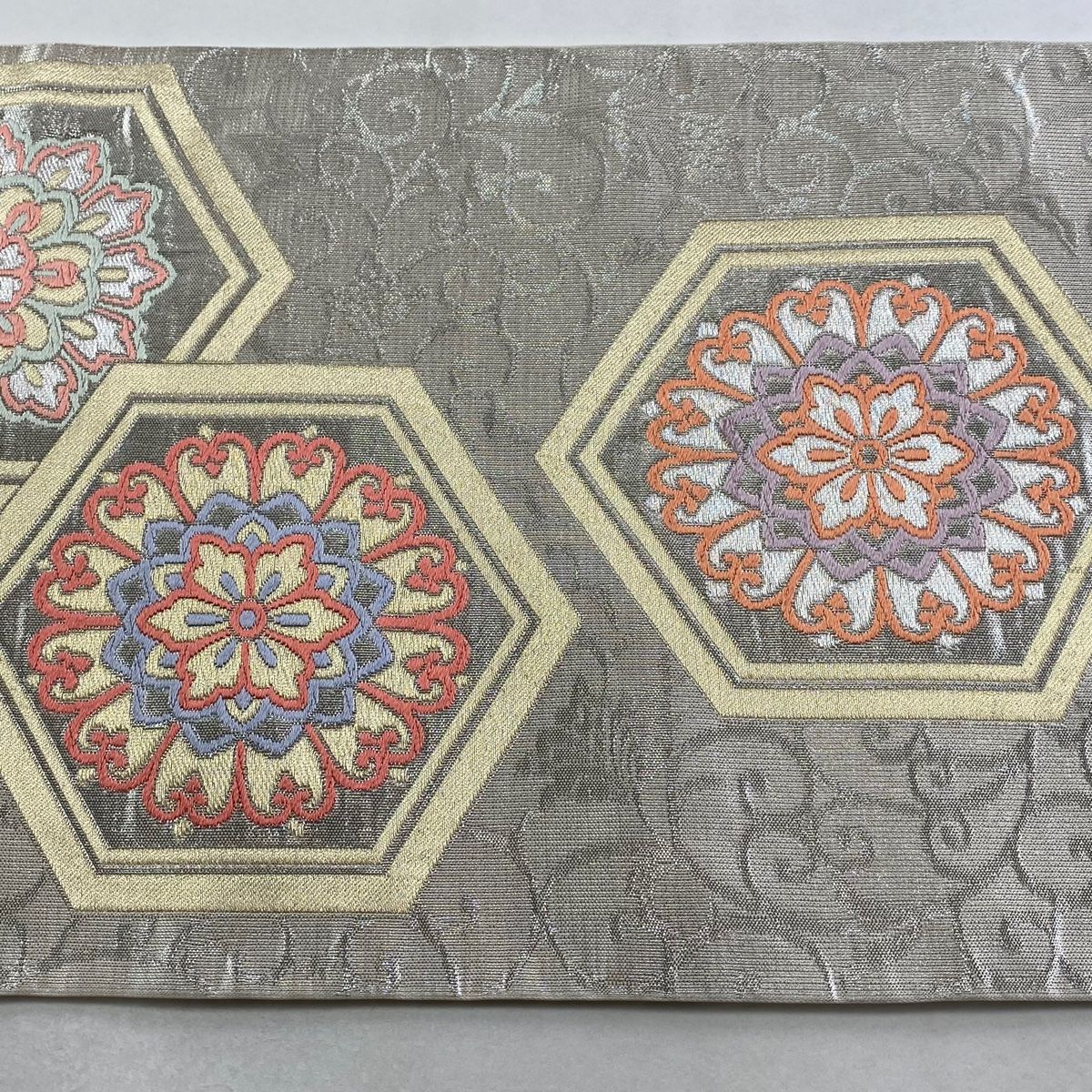 袋帯 秀品 川島織物 落款 関西仕立て 華文 亀甲 銀糸 箔 銀色 六通 正絹