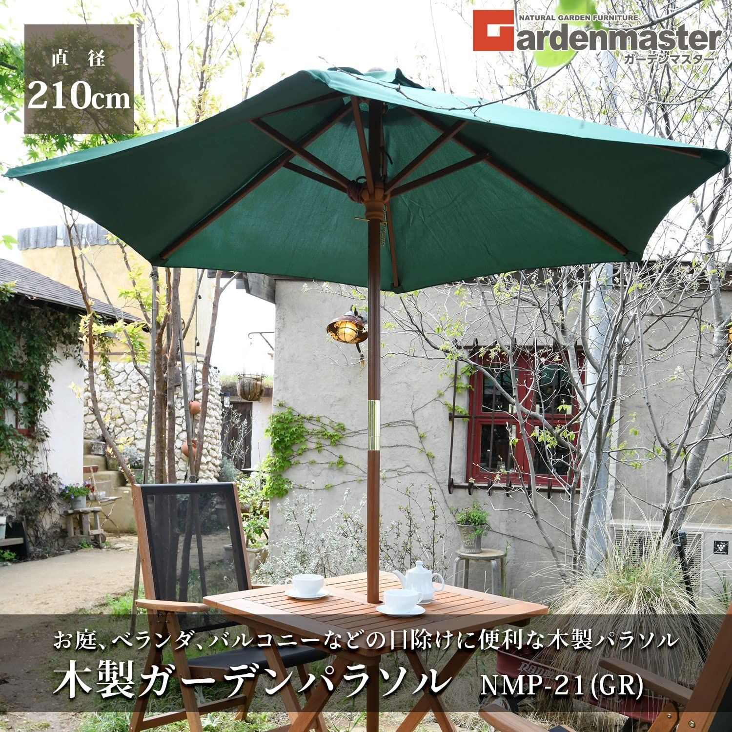 グリーン NMP-21 GR ガーデンマスター 日よけ バルコニー テラス ベランダ お庭 直径210 cm 木製パラソル ガーデンパラソル 山善