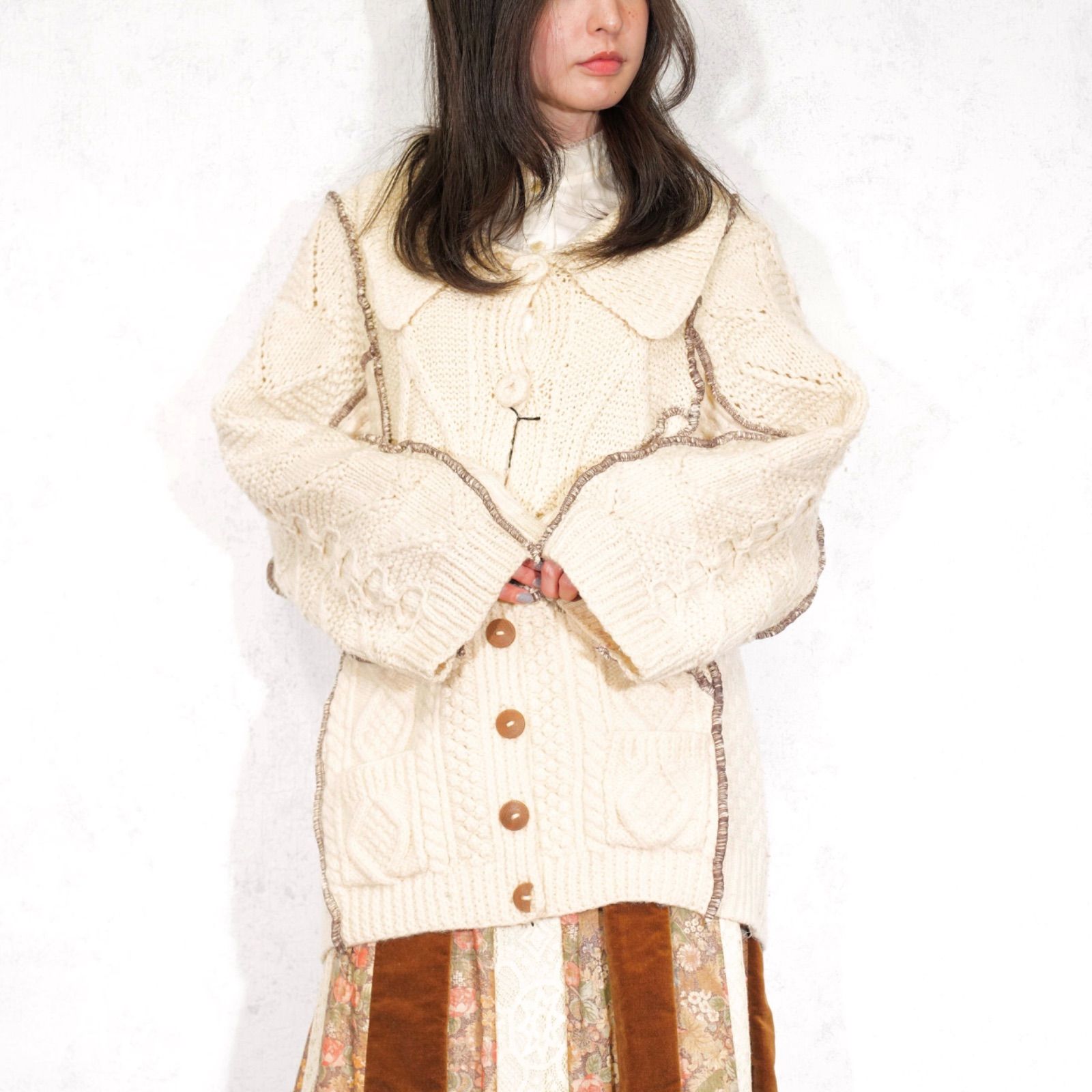 EU VINTAGE COLLAR DESIGN PATCHWORK REMAKE CABLE KNIT CARDIGAN|ヨーロッパ古着襟付きデザインパッチワークリメイクケーブルニットカーディガン ニットジャケット フィッシャーマンセーター|アランニット