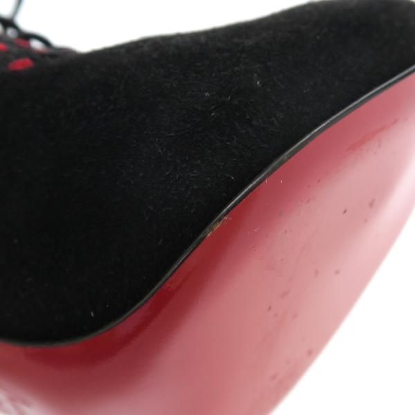 ■採寸#38日本サイズ約25cmヒール13cm甲幅7cmルブタンよりレースアップブーティーが入荷しました。編み上げと赤がポイントのレースで女性らしさの組み合わせが素敵です。ヒールはやや高めですがパーティなど華やぐこと間違いなしです。スエードなので左ヒールに起毛が見られます。右外側と左内側にスレがあり、足底は左右ともに汚れがあります。どうぞお気軽にお問合せくださいませ。
