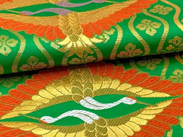 七五三 袋帯 正絹 桐生織 こども ジュニア用 全通の女の子用祝帯 仕立て済み 緑 立涌に向かい鶴 JFS 589