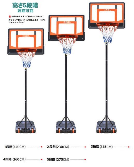 三方良し 220~275 cm バスケットゴール ミニバス ミニバスケットボール バスケットボール バスケット ゴールネット 屋外用バスケットゴールスタンド 子供 大人 キッズ ジュニア小学生 5号球7号球 家庭用 バスケ 持ち運び部活