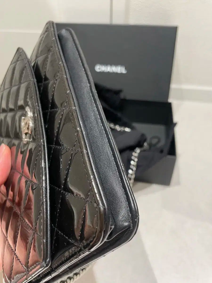 このシャネルWOCショルダーバッグは、光沢のあるペンダント素材で作られています。シルバーのロゴとチェーンが高級感を醸し出しています。バッグの内側にはカード入れがあり、財布のように使えます。