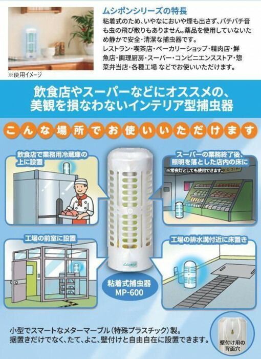 ポンと置くだけのコンパクトで無害・清潔な捕虫器。据置きだけでなく、たて、よこ、壁付と自由自在に設置できます。面倒な設置工事は不要!!プロも使う業務用なので捕獲力は抜群。粘着式のため、いやなにおいや煙も出さず、バチバチ音も虫の飛び散りもありません。飲食店やスーパー・コンビニの衛生管理、各種工場での異物混入対策など、さまざまな目的の防虫対策に効果を発揮します。