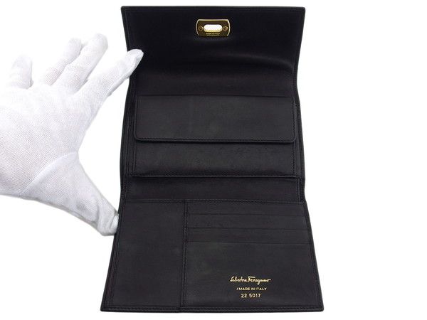 サルヴァトーレフェラガモ Salvatore Ferragamo 三つ折り財布 ガンチーニ ブラック×ゴールド レディース