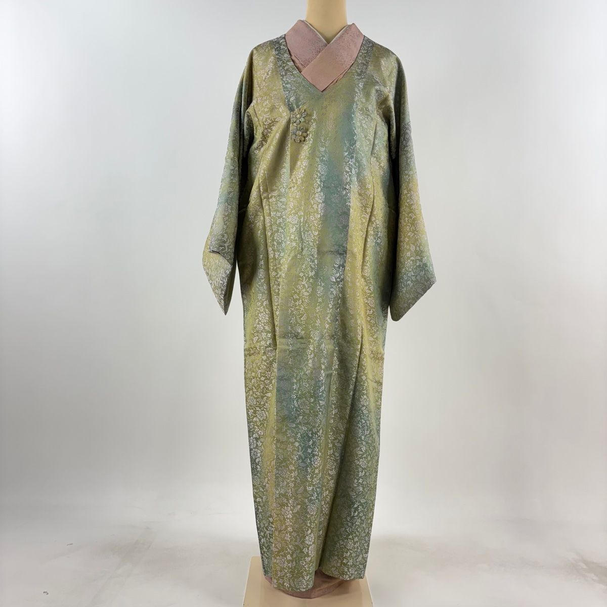 道行 身丈139.5 cm 裄丈68.5 L 和装コート 千代田衿 草花 鳥 ぼかし 黄緑色 正絹