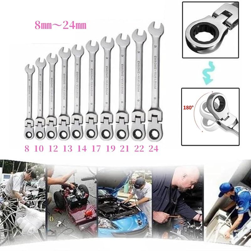 8 24㎜ 首振りラチェットレンチ ギアレンチ めがねコンビネーションスパナ 板ラチェット 角度調整可 工具 整備 メンテナンス 作業 DIY 10本セット 8㎜10㎜12㎜13㎜14㎜17㎜19㎜ 21㎜22㎜24㎜